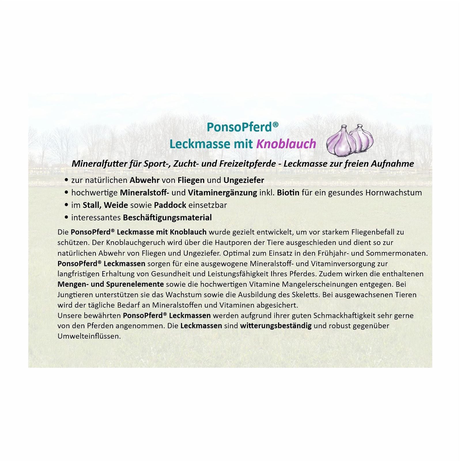 Die PonsoPferd® Leckmasse mit Knoblauch wurde gezielt entwickelt, um vor starkem Fliegenbefall zu schützen. Der Knoblauchgeruch wird über die Hautporen der Tiere ausgeschieden und dient so zur natürlichen Abwehr von Fliegen und Ungeziefer. Optimal zum Einsatz in den Frühjahr und Sommermonaten.