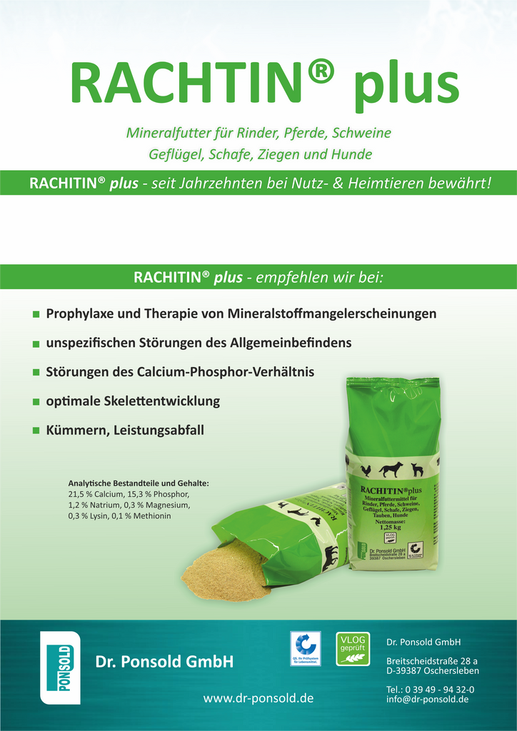 RACHITIN ® plus ist aufgrund der Zusatzstoffe und dem Ca : P - Verhältnis von 1,40 : 1,00 bestens zur Verhinderung von Mineralstoffwechselstörungen geeignet.